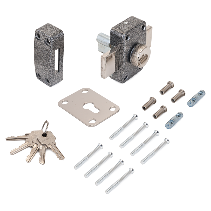 Замок накладной цилиндровый с вертушкой. Предназначен для установки на деревянные двери. Засов - цельный прямоугольный стальной ригель, общей длиной 114мм. Габариты корпуса замка - 90х56мм. Комплектация - 5 ключей, запорная планка со стяжками, наружная накладка со стяжными болтами. Механизм замка под англ.ключ, идет совместно с корпусом. Закрывание и открывание замка изнутри производится вертушкой, снаружи ключом. Имеет фиксатор, которым можно полностью блокировать замок. Совпадает по посадочным отверстиям с замком ELP Казань.